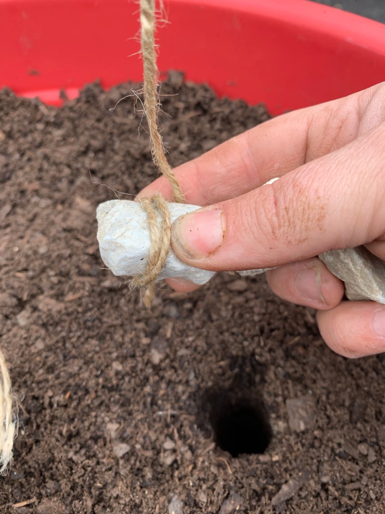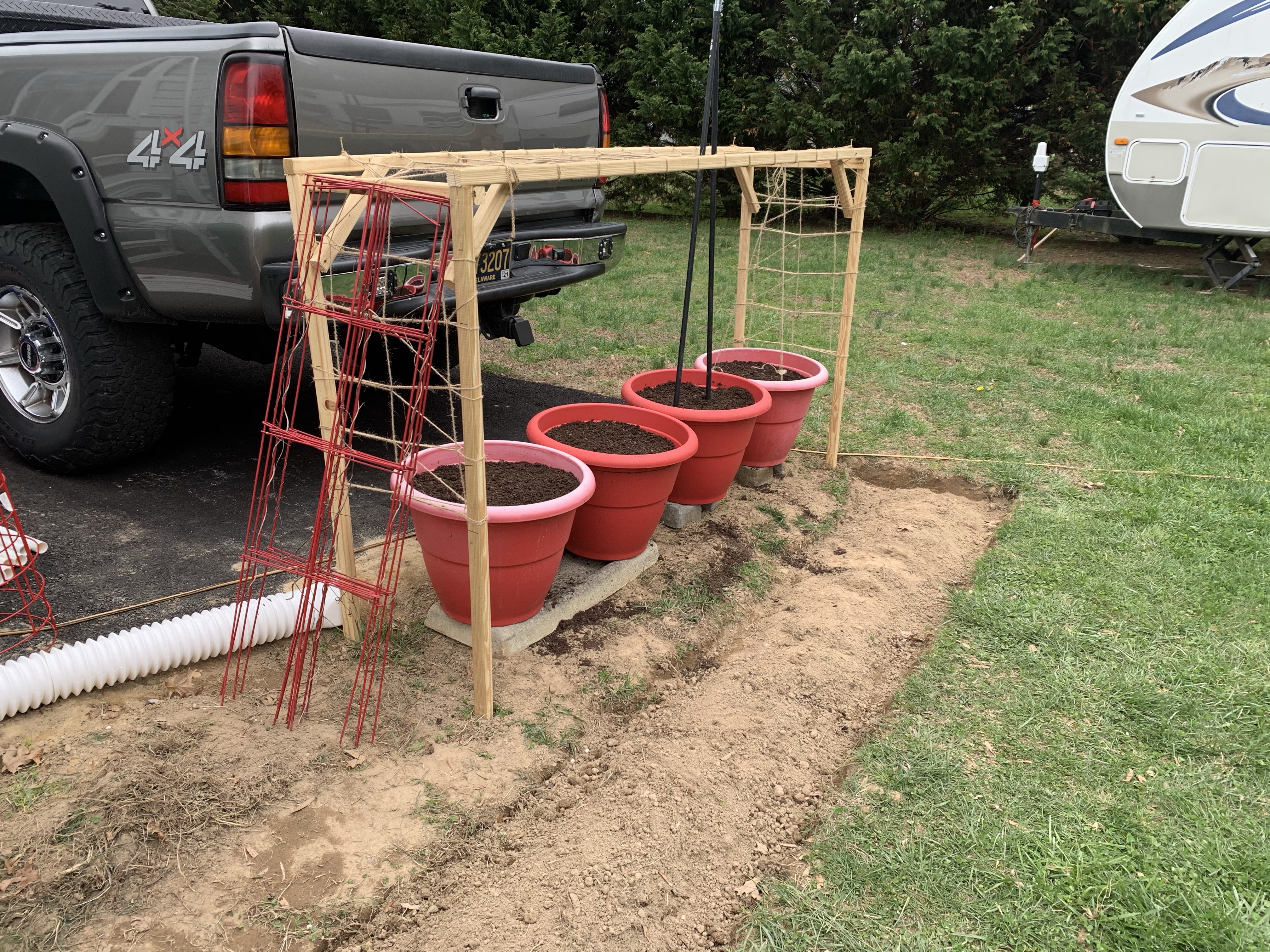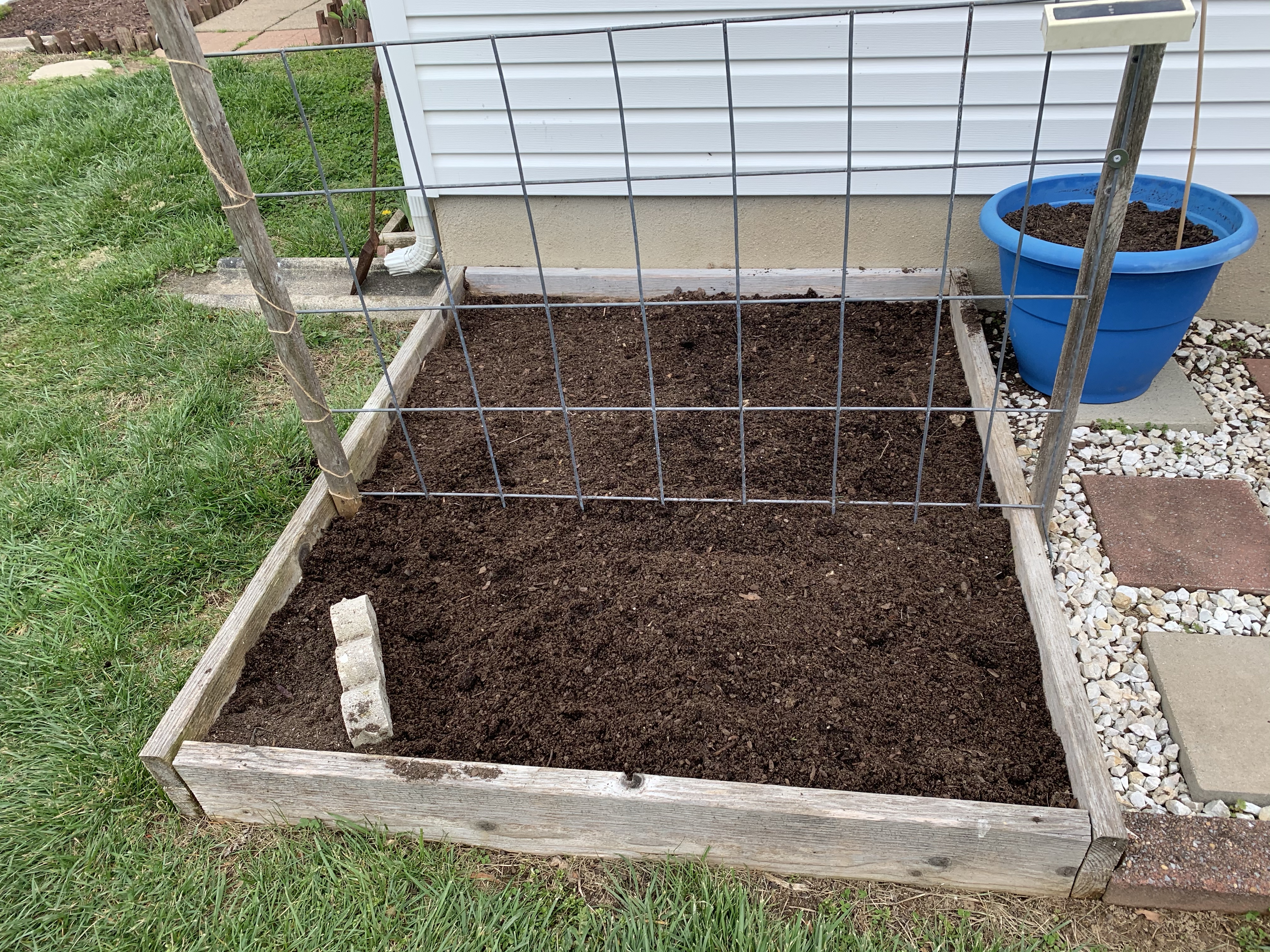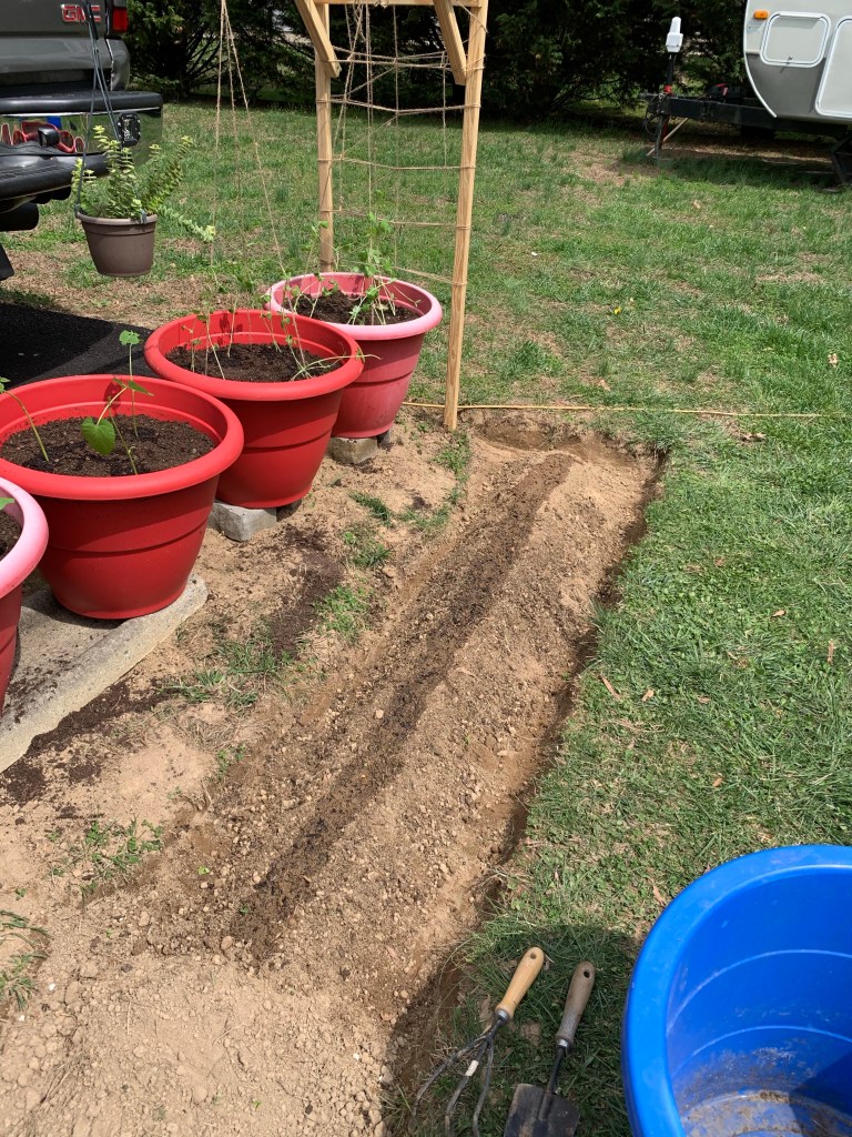 They were ready….even if the garden wasn’t. I filled my raised beds with garden soil.Filled up my pots, too. I was experimenting with ways to help the vines grow up to the strong trellis up top….I decided tying some twine to rocks and burying the end under the dirt….that turned out to be the best way for me to create a secure line for the vines to grow on.Tucking the stones under the dirt was not only secure, it also looked neat and tidy. King Tut purple hull peas IN!! Now it’s time to get these cold weather loving seeds in the ground….remember, don’t plant 40 all at once. I am going to be sowing a few a week in between each other to ensure a steady supply of veggies. I made a tiny furrow (dip) along the top of this mound for the seeds to go in. After sowing the seeds in, I rough up the top of the furrow to gently put the seeds underneath the dirt, then I water them in thoroughly. There is a whole row, watered in and ready to grow. Fingers crossed, since I prefer to start seeds indoors, but this year I am growing more than ever so I couldn’t fit any more on my kitchen table.
